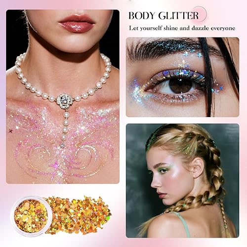 Multi-functional body glitter gel: This body glitter gel is the ideal choice for creating a dazzling look. It can be used on the eyes, face, hair, nails, eyebrows, lips, cheeks, and collarbone. With its vibrant colors and holographic sparkle, it highlights your charm.
