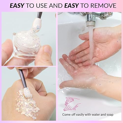 Easy Application, Easy Removal Face Glitter Gel: No glue needed face glitter develop a gel consistency that's easy to apply and doesn't feel sticky upon drying. You can use your fingers or easy-to-use applicator included to apply it effectively. And the face glitter gel easy to remove using soap, warm water, or makeup remover, without causing irritation. Rapid-dry formula ensures you're ready to dazzle in minutes, hassle-free.