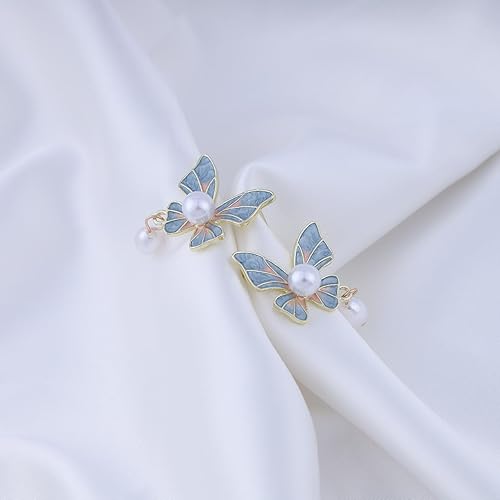 Boho Acrylic Butterfly Pearl Drop Earrings Gold Pearl Dangle Earrings Blue Enamel Butterfly Earrings Vintage Resin Butterfly Stud Earrings Jewelry for Women