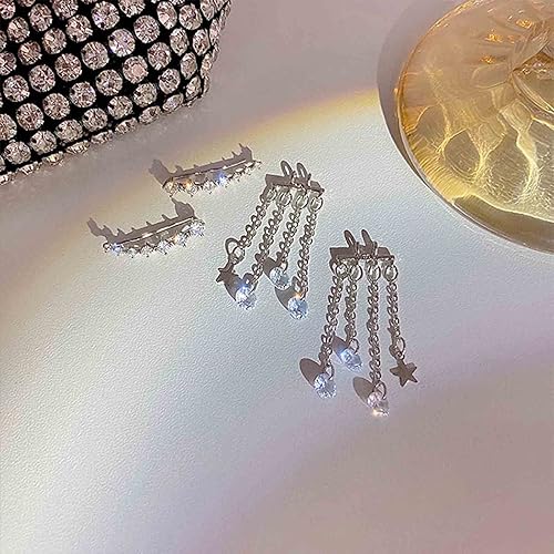 Boho Star Ear Jacket Earrings Silver Cz Star Ear Climber Earrings Crystal Chain Tassel Earrings Crystal Ear Crawler Long Chain Earrings Jewelry for Women Gifts (Silver)(Silver)