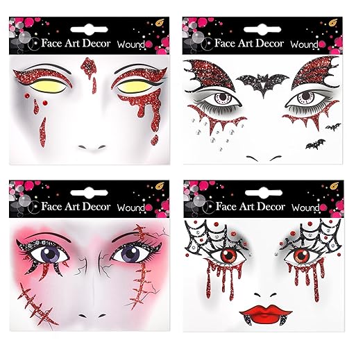 Halloween Face Glitter Makeup: Our Halloween tattoos includes 4 different pattern styles kind of red black stickers. This halloween stickers for kids allows you to experience 4 different Halloween makeup and also enjoy with friends and family. The fixed makeup styles of this glitter tattoos can make it easy for even novices to create a stunning glitter makeup, the rich patterns are separate, so you can create more unique makeup, such as zombie makeup, clown makeup, scar makeup, vampire makeup.