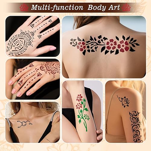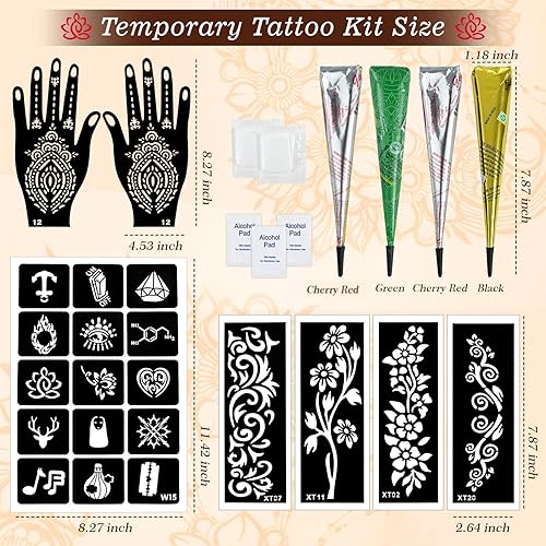 Temporary tattoo kit:Create stunning body art in minutes! This 4 brown piece temporary tattoo kit 3 pcs alcohol pads premium stencils. Safe, non-toxic & waterproof for all ages – express yourself worry-free!
