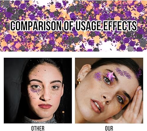 【Safe and Gentle】Body glitter gel is vegan and not tested on animals. Face glitter gel is milder, has no harsh smell and will not irritate your hair, body or skin. The orange purple and black glitter stick is waterproof and sweatproof, not easy to fall off, and can hold makeup for 24 hours.You can use it with confidence.