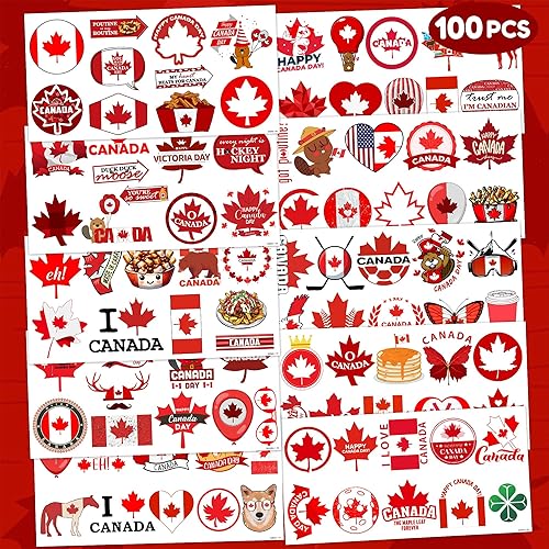 Canada Temporary Tattoos Happy Canada Day Party Decorations Favors Supplies Themed Cute Stickers 10 Sheets 100 PCS Gifts for Baby Girls Boys Class School Carnival