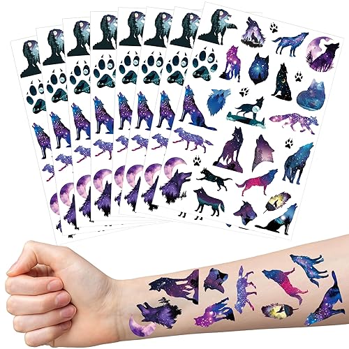 Cat Dog Paw Print Temporary Tattoos - 200+ Pet Themed Birthday Party Favors, Paw Print Party Supplies Decorations, Treat Bag Stuffers for Kids Boys Girls, School Prize(8 Sheets)(starry wolf)