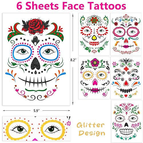 What You Get : 6 sheets Day of Dead glitter temporary tattoos, the size is 5.9 x 8.2 inch