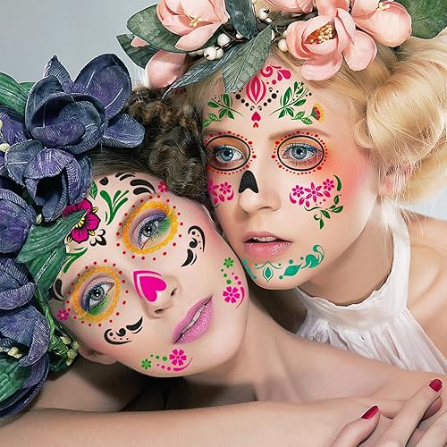 Comment on "Ceiba Tree Day of Dead Glitter Tattoos 6 Sheets Halloween Temporary Sugar Skull Face Tattoos Floral Skeleton Full Face Mask Stickers for Women Adult Kids Halloween Party Favor Supplies Decorations"