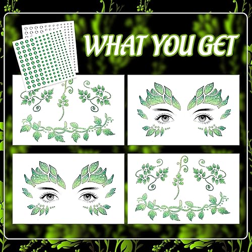 【Halloween Leaf Makeup Kit】You will get a Halloween leaf Girl Makeup Kit, including 4 Sheets leaf face tattoos + 1 sheet Green Face Gems + 1 sheet White Face Gems. Tips: 4 Sheets of leaf Face Tattoos are two packs of leaf makeup patches. Convenient for sharing with family and friends.