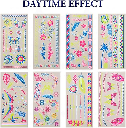 【What You Get】--8 sheets of fluorescent tattoos is glow in UV light/blacklight! Size--about 21x10.5x0.03cm each sheet. These sparkle tattoo stickers will make you outstanding of the party!