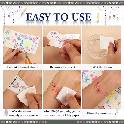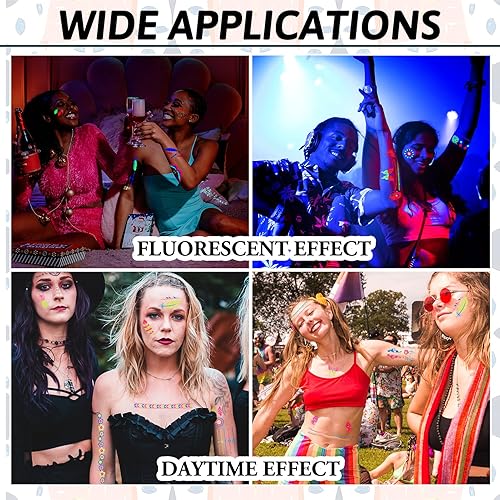 【Various Occasion】--These luminous tattoos are suit for Halloween & Christmas makeup, night parties, bachelorette party, carnival, campfire party, club show, concerts, prom night, wedding, vacations, night out or anywhere with UV Lighting.
