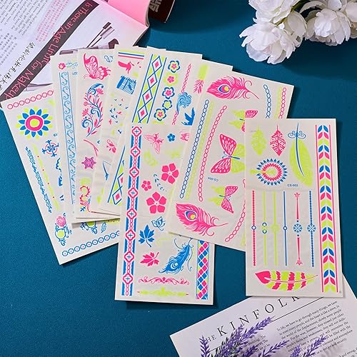 Cheriswelry 8 Sheets Glow In Dark Neon Temporary Tattoos Fluorescent Sticker Supplies UV Blacklight for Party Festival Makeup Decoration Crafts 15x10.5x0.03cm(Mixed Color-8 Sheet)