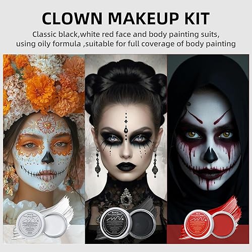 Clown Makeup Kit, White Black Red Face Body Paint Set, Halloween Clown Joker Makeup Kit, Professional Black, White and Red Face Painting Kit for Halloween Make Up, Sfx Make Up, Cosplay, Costume(Black White Red)