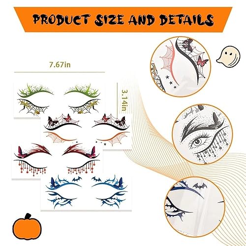 Halloween Face Tattoos for Women Girls: The halloween eyeshadow tattoos can immediately create a terrifying yet cool atmosphere at a halloween party, face tattoos design of the witch bat, spider web, and butterfly adds a mysterious, terrifying and strange charm to halloween, makeup eye stickers making you the star of the show, attracting all eyes, and adding unforgettable memories to the holiday event