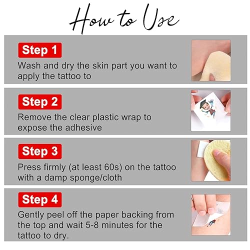 How To Use: Wash and dry the skin part you want to apply the tattoo. Remove the clear plastic wrap to expose the adhesive. Press firmly (at least 60s) on the tattoo with a damp sponge/cloth. Gently peel off the paper backing from the top and wait 5-8 minutes for the tattoo to dry.