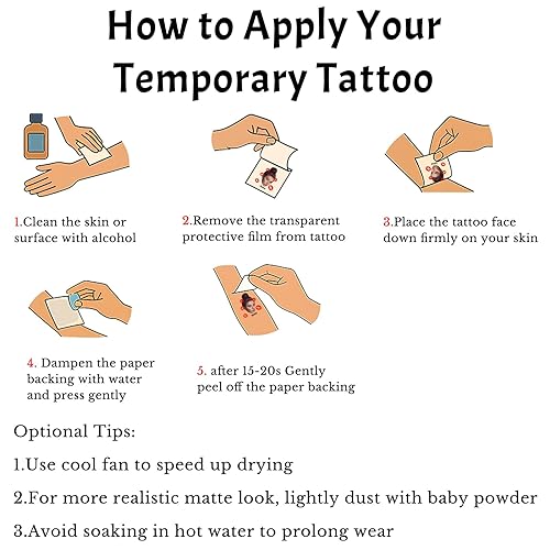 Easy to use and remove: Choose your favorite tattoo, stick it face down on your skin, then wet the tattoo with water and wait for twenty seconds, gently tear off the paper surface protective film, and you're done! It can be easily removed by wiping with makeup remover or alcohol.