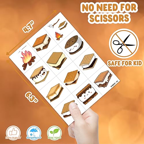 Cute S’mores Temporary Tattoos – Camping & Campfire Birthday Party Favors, Baby Shower Supplies, 5 Sheets 60PCS Stickers for Kids, Girls, Boys, Class Decor
