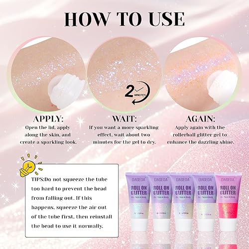 Widely Used:The roll-on glitter gel is suitable for use on various parts of the body, serving as glitter eyeshadow, facial glitter, hair glitter, body shimmer makeup, and more.For a more intense shine, apply one coat, wait approximately two minutes for the gel to dry, then apply another coat for an even more dazzling finish.