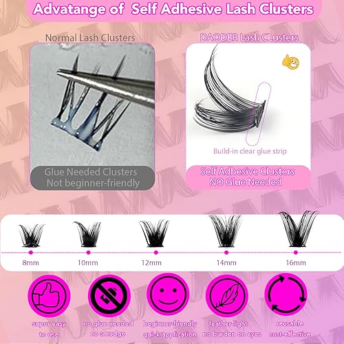 Self Adhesive Lash Clusters Kit NO Glue Need: Get the press-on convenience of the DAODER Self Adhesive Lash Clusters Kit. This eyelash clusters kit gives you 120 pre-glued clusters lashes with a strong, built-in adhesive—meaning no messy extra glue. Complete with blunt-tip precision tweezers, this lash clusters kit makes application fast and easy for everyone, from beginners to pros.