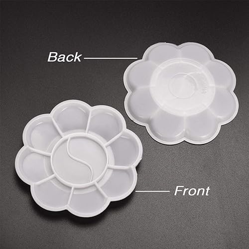 Unique design. Round flower shaped plastic pallets with 10 slots and 2 center tanks, ideal for mixing colors and preventing cross contamination.