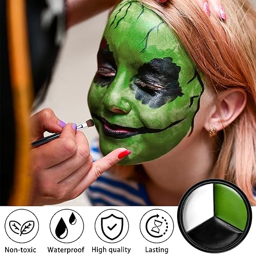 Natural Colors:Our face and body paint has a smooth and soft texture, excellent water resistance, and applies effortlessly. Use a brush to outline details and a sponge to apply full-face makeup. You can mix the three colors—black, white, and green—to create a unique look that will turn heads.