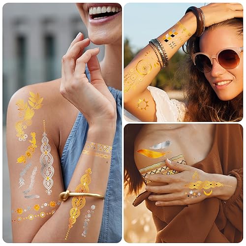 【10 Sheets Metallic Tattoos】There are 10 large sheets temporary tattoos for women adults 21×14.8cm (8.26*5.82 inches). Tattoos to suit your every mood you'll find elephants, feathers, flowers, bracelet tattoos, and other beautiful designs. This series will make you look different, natural, graceful, and elegant, and become the focus of the party!