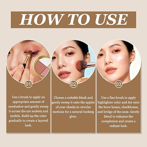 HOW TO USE: EYES: Blend matte shades into crease → Press shimmer on lid (no primer!). CHEEKS: Smile → Swirl blush on apples (self-adjusts to YOUR flush) . GLOW: Tap highlighter on cheekbones → Collarbones → Cupid’s bow. Pro Secret: Use the warm-toned highlighter as eyeshadow for monochromatic magic.