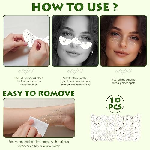 Easy to Apply and Remove: Face glitter freckle stickers simplify your beauty routine. Peel off the backing, apply to skin, dab with a wet sponge, and let dry. Removal is just as easy with makeup remover or warm water, leaving no residue