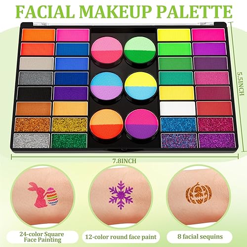 【Child-Safe Halloween Makeup Kit】- Our 44-color rich pigmented colorful paint and the body glitters are hypoallergenic, non-toxic and is gentle for all skin. Suitable for all skin types, featuring non-toxic, water-activated face paint designed for sensitive skin. Free from preservatives and cruelty-free, safe for both children and adults. For optimal comfort, perform a patch test on a small skin area before use.