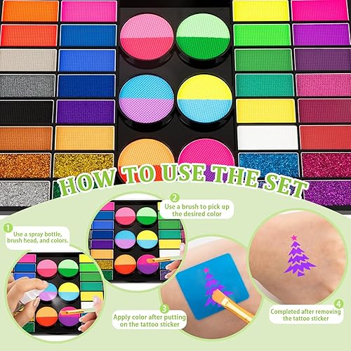 【Face Painting Kit for Kids and Adults】- Includes 44vibrant colors (16 matte shades, 8 glitter shades, and 20 UV-glow paints), 6 reusable face painting stencils, 11 brushes, 2 gem stickers, 6 sheets / 70 tattoo templates, 8 makeup sponge, , and instructions. A comprehensive professional face painting kit, these tools empower everyone to create stunning face and body art with ease.