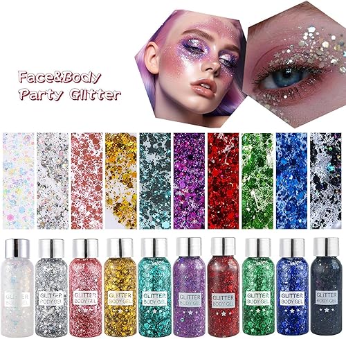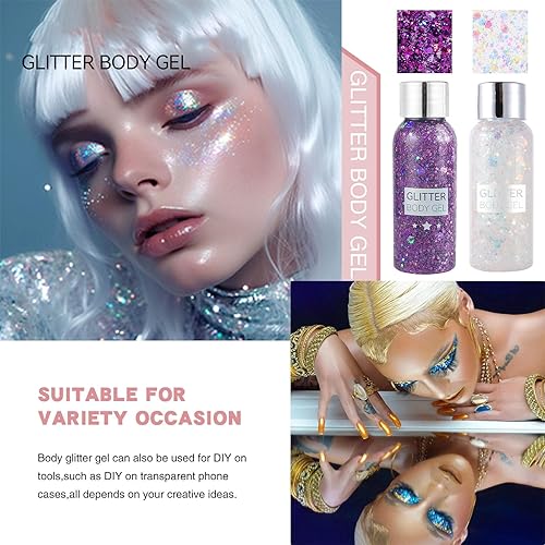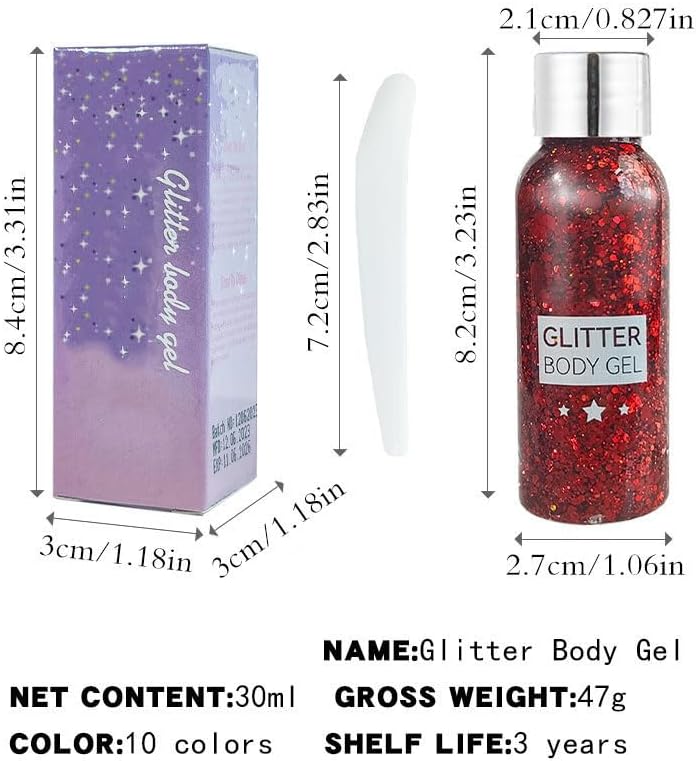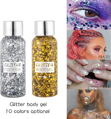 MULTIPURPOSE, This body glitter gel is not only suitable for face, but also can be used for many parts of the body, eyeshadow, lips, cheeks, hair, nail art, cell phone case DIY and so on.