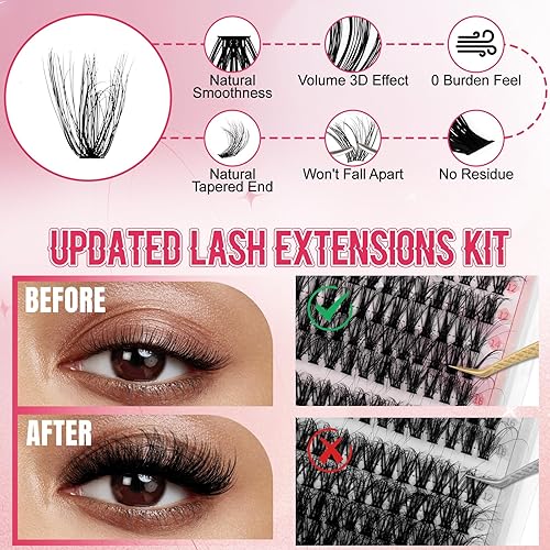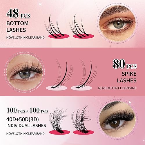 DIY EYELASH EXTENSIONS: Our eyelashes have two rows of 5-6mm bottom eyelashes (48 PCS), four rows of 12-18mm 7D spikes eyelashes (80 PCS), and five rows of each different style of 12-18mm lash clusters. The 40D+50D style has a total of 200 PCS, the 60D+80D style has a total of 190 PCS, and the 100D+200D style has a total of 130 PCS. You can DIY at home instead of going to a salon, thus saving more money and makeup time, providing greater convenience.