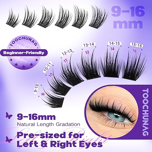 Pre-Sized Eyelash Clusters for Left&Right Eye: Follow the pre-arranged lashes to apply for effortless cat eye lash extension effect with a beautiful natural length gradation. 9-18mm options cover daily (9-14mm) and bold (14-18mm) looks—just 2-3 clusters make a charming half-eye fox-eye shape.
