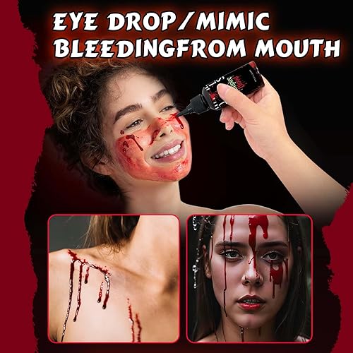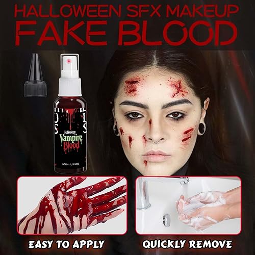 Easy to Use&Washable:Vegan & Cruelty-Free Blood effect product is crafted with Friendly ingredients, the thin texture allows for easy application. Simply rinse with warm water and follow up with a soap cleanse, If bloodstains occur, they can be gently wiped away with makeup remover. Residue on clothing can also be eliminated by soaking in a mixture of warm water and detergent for half an hour.