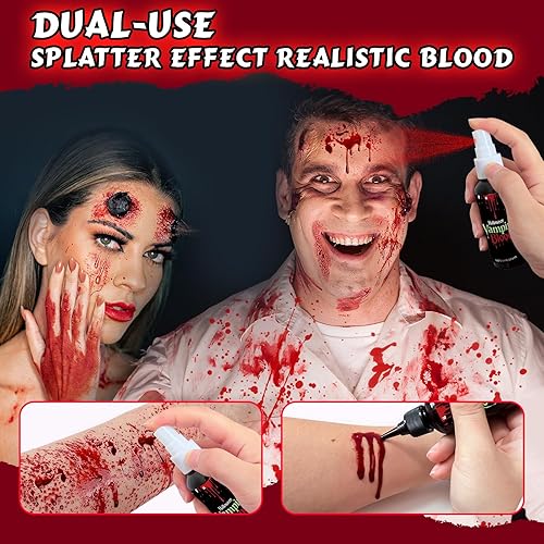 Realistic Blood Splash Effect:The fake blood spray effect on vampire costumes is very easy to use,also for clothes bloody makeup.Use after applying make up to add blood effects and detail. Easily to create blood splatter FX. Hold it a certain distance depending on what type of Splatter you want, spray away from self for a splatter effect.
