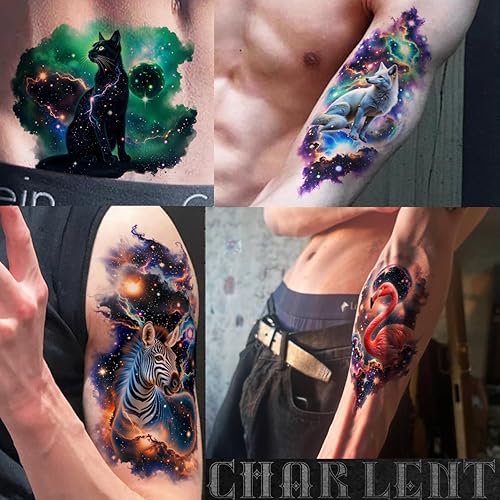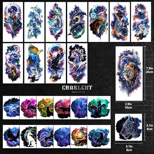 ⚡Realistic 3D Galaxy Themed Animal Temporary Tattoo Stickers -- Features a stunning collection of galaxy - themed animal tattoos, combining the beauty of the cosmos with majestic animals like lions, tigers, and dolphins. That you can use for different locations on your shoulder, arms, chest,leg, etc. Easy to share it with your family and friends.