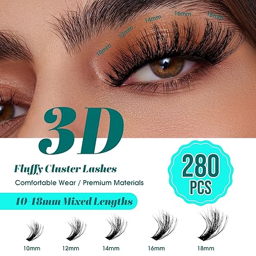 GEMERRY Lash Extension Kit Lash Clusters Kit 3D Effect DIY Lash Extension Kit with 280Pcs Fluffy Eyelash Clusters, Lash Bond and Seal and Tweezers DIY Lashes at Home(3D-100P-10-18mm)(Fluffy-80D+100D,10-18mm)