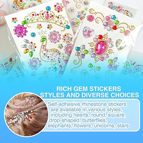 Multi Use Sticky Gems for DIY: Unleash creativity with 10 assorted sheets of diamond stickers! Use them for customizing shoes, phone cases, or holiday cards. The water resistant adhesive keeps gems secure, even outdoors. Ideal for costumes, festival looks, or home décor accents