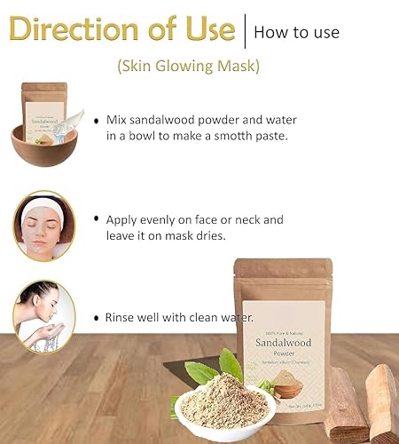 How to use/DIY-Mix 1 tablespoon of Sandalwood powder and 1 teaspoon of Rose petal powder with milk to form a fine paste. Apply this on the face and neck area and leave for 15 minutes. Do this once or twice a week for smooth, supple skin.