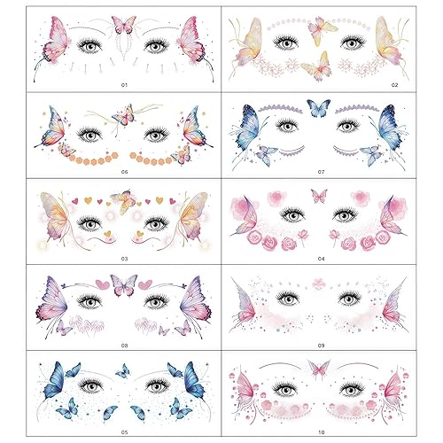 Glitter Butterfly Face Tattoos – 10 Sheets Temporary Makeup Stickers for Festival, Party, Cosplay and Halloween(Multicolor Butterfly A)