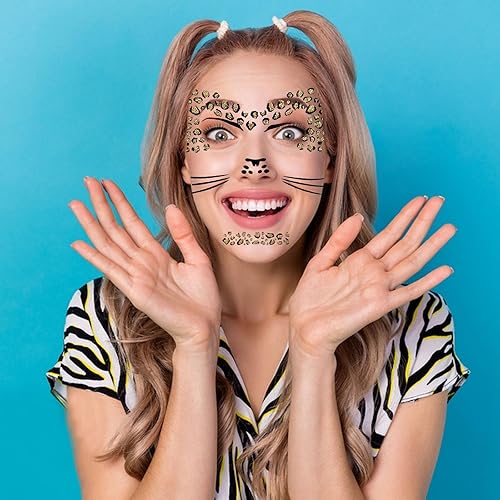 Glitter Leopard Face Tattoos – These cheetah costume women face tattoos stickers have a glittery surface to create a super sparkly effect. The leopard print is divided into several large pieces according to the contour of the face, just cut in the blanks to get a leopard pattern that fits the blanks of your face, avoiding excessive cutting and simplifying the application, making it easier for you to use the leopard face stickers