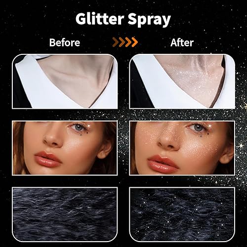 Lightweight & Portable: Designed to be small and portable, our glitter spray bottle lets you shine anywhere, anytime. Shake the bottle before use, lightly spray on your skin, and the sparkling glitter will gently adhere, giving you a radiant glow wherever you go.