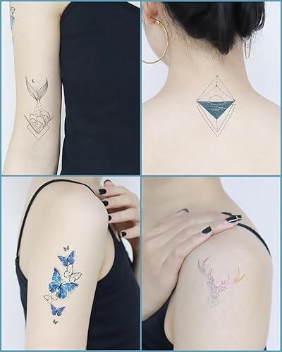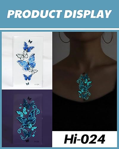 Sheet Dimensions: Each tattoo sheet measures 4.3 x 2.36 inches, offering multiple delicate butterfly and flower designs in black with blue glow effect