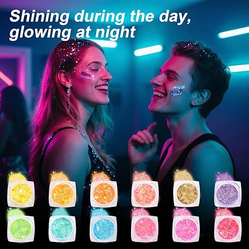 Glow in The Dark Face & Body Glitter Gel – 12 Colors Chunky Holographic Glitter for Hair, Body, Festival, Party, Rave Makeup, Washable Cosmetic Glitter for Women, Teens, Kids, Halloween