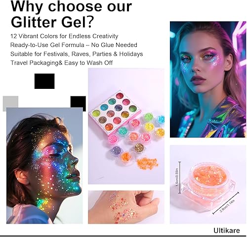 Subtle Glow Effect in Dim Light This glitter gel offers a gentle glow when the lights are low, adding an extra highlight to your look. Suitable for face, hair, and body styling during evening events or night parties.