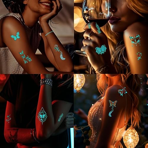 Fashion Style Luminous Design Fake Tattoos For Adults:3D DIY Luminous Temporary Tattoos Stickers For Women Party Favors Supplies, Birthday Gifts, Outdoor, Group Activities, Tumblers Cups, Festival Decorations, Stocking Fillers, Basket Goodie Bags Stuffers, Party Favor Supplies,If you want tattoos to glow in dark quickly, tattoos need to be exposed to strong light ,such as phone flashlight