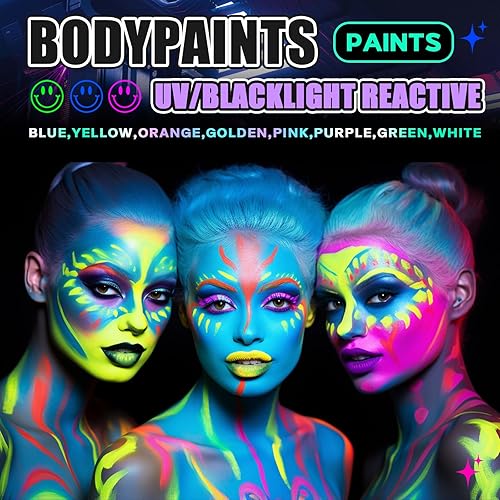 【Bright Colors Under UV Light Neon Body Paint】High pigment glow blacklight face body paint can use for eye ,face and body. Fit for fancy ball, parties, club,photoshoot, or night-out.Festival like Halloween,Christmas, New Year, Birthday, Valentine's Day,etc. NOTE:In the dark,our face paint does not glow unless under UV blacklights.