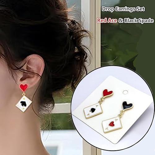【Heart Necklace & Gold Plated Asymmetric Drop Earrings with Red Ace Card Black Spade Set】Necklace & earrings with dimensional heart pendants. Gold-tone alloy withstands all-night croquet games. Hypoallergenic for sensitive "royal" skin.