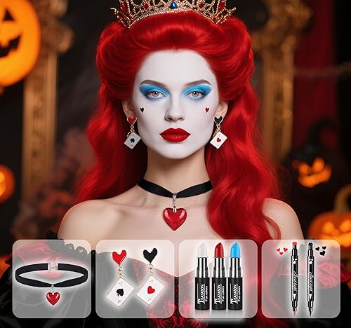 【Complete Halloween Queen Women Makeup Kit】Includes 3PC face & lip paint (red/white/light blue), 2-in-1 heart eyeliner stamps+liquid eyeliners (red/black), & heart necklace & earrings set. Everything for authentic Wonderland royalty at haunted balls or zombie proms.