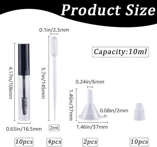 [Mascara Tube Bottle]: This mascara tube bottle kit includes 10pcs 10ml(0.34fl. oz) mascara tube bottle: 10.6x1.65cm(4.17x0.65inch); 4Pcs 2ml plastic droppers: 37x6~37mm(1.46x0.24~1.46inch); 2pcs mini transparent plastic funnel hoppers.