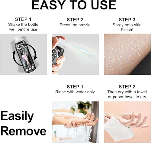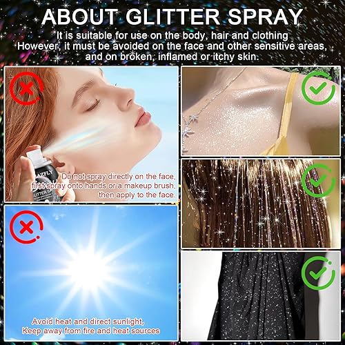 【Easy to Use & Clean】Shake the glitter spray and hold 6-10 inches away from dry hair or skin and spray all ove, and let it set for 60 seconds.And stays put through sweat and humidity. Our hair glitter spray can be easily removed with shower and shampoo.